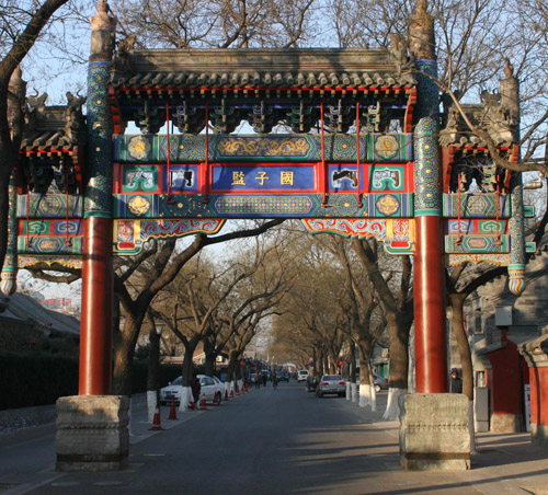 在唐时有乌头门之形制,似由对立的两柱之中,加以门扉,置于大门之外,此样式变为后世的棂星门,现在仍有,如各坛庙之棂星门[参见乐嘉藻:《中国建筑史》,团结出版社,2005年1月,第88页]。据此可知,孔庙属于坛庙,孔庙大门一般都有棂星门,北京孔庙大门称“先师庙”,其形制虽与其他孔庙不同,但也曾称为棂星门[据乐嘉藻先生对“棂星门”之注解:灵星即天田星,古时祭先祭灵星。宋仁宗天圣六年(1028年),在郊外筑祭台,外垣置灵星门。宋景定《建康志》载,移灵星门用于孔庙,即以尊天之礼尊孔。后来以门形如窗棂,故改称灵星门为棂星门]。北京的天坛圜丘坛、地坛方泽坛、日坛内坛等皆有棂星门,它是坛庙的重要标志。也有用作牌坊式的,各公署大门外之辕门牌坊,也属于此类型。据此可知,国子监街上的“国子监”牌楼,应该由此而来,因为国子监属于教育行政管理机构,其最高官员祭酒清初曾经是正三品,后改为从四品。因此,“国子监”牌楼应是作为公署而设的。这一形制应该是由唐之乌头门发展而来的。由此我们也可以知晓,无论是坛庙还是衙门公署,它们应该都具有一定的品级,是君主制时代权威等级制度的一种象征。