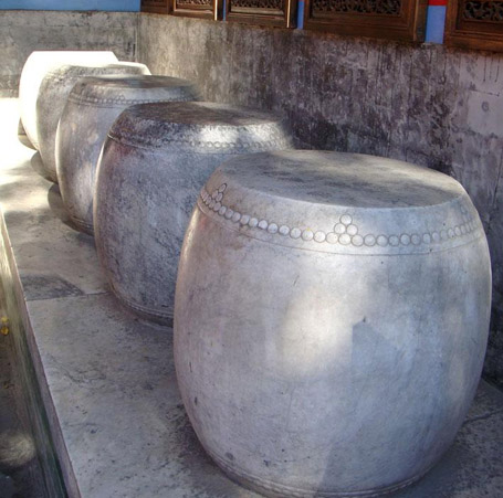 周石鼓在北京孔庙大成门内的具体排列方式和情形,也是可考的。据道光本《钦定国子监志》记载,第一至第五鼓当时均在大成门内东侧,西向;第六鼓至第十鼓在大成门内西侧,东向。