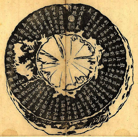 文中所言宋司马池知凤翔时所丢失、后被向傅师搜回的那枚石鼓为第六鼓,因经五代之乱,流落民间,被凿以为臼。至乾隆庚戌(1790)年春,乾隆皇帝在此鼓石臼周围平面上题刻诗跋。其辞曰: