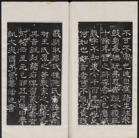潘氏石鼓文音训碑完成后,遂与周石鼓中的第六至第十鼓并立于北京孔庙大成门门内西侧,直到一九三三年,潘迪音训碑与周石鼓一起开始南迁。《钦定国子监志》等文献中均有相关之记载。(下图为哈佛大学藏潘迪音训碑拓片)