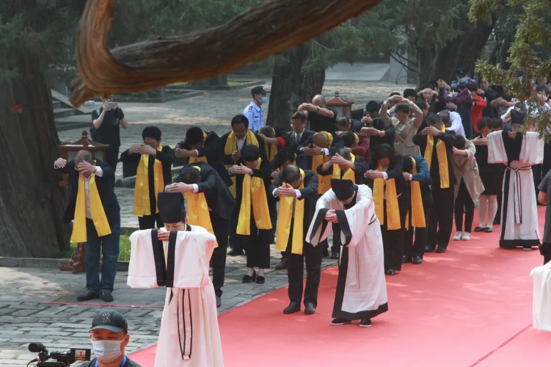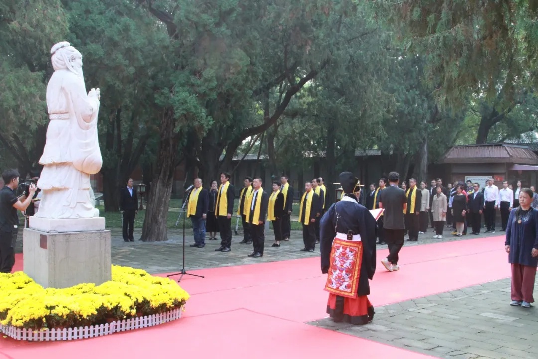 活动当天,这座有着700多年历史的皇家孔庙红毯铺道、黄菊漫地、黄绸围栏,一派庄严神圣的景象。