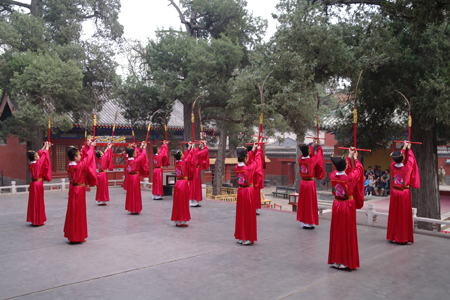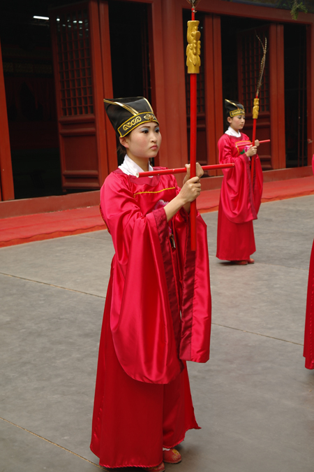 第四幕:《大同》——在一片祥和、庄重、肃穆奏乐声中,舞生行进有序地表演祭孔“八佾舞”。通过诵读《礼记.礼运》大同篇,再现天下大同,千秋宁和的景象。表达了古人对大同社会追求的理想。让人们感知到:古人和谐思想与和谐社会历史文化背景,对构建现代和谐社会具有的积极意义。