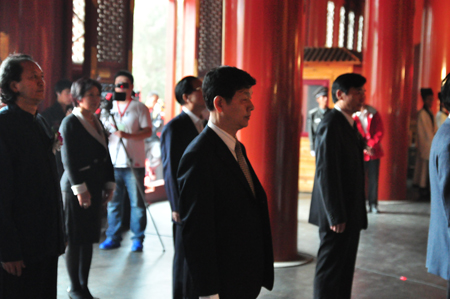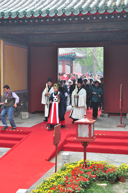 9:30分,随着典仪齐唱“起户”,钟鼓齐鸣,肃穆的音乐响起,来自社会各界的领导、专家、学者以及市民代表由国子监持敬门缓步进入孔庙祭祀现场,行至大成门下孔子像前,来宾神道两侧就位,孔庙和国子监博物馆馆长吴志友先生宣读告文:“告:公元2011年岁次9月朔28日,孔历2562年;首都社会各界致祭于大成至圣先师;惟师、德陪天地,道冠古今,删述六经,垂宪万世,……宣读完毕,全体嘉宾向“至圣先师”孔子行“四拜礼”。行礼完毕,典仪引领嘉宾进入大成殿主祭现场。“大道之行也,天下为公......”80名国子监中学的学生在孔庙中院高声朗读“礼运大同篇”。