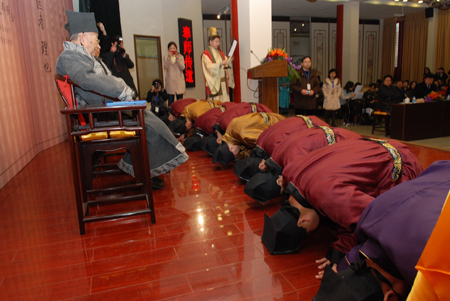 9时30分,拜师仪式开始。北京市中医药管理局副局长屠志涛致词祝贺。9名拜师学生诵读《论语  颜渊》、《礼记  学记》、《鹿鸣》等篇章,向恩师呈束修六礼,呈夏楚两物,呈敬师礼茶,行三拜九叩礼。师长回礼,悬壶济世。见证人呈见证帖,加盖见证章。整个拜师礼体现了中华民族尊师重教的传统美德,开创了中华中医药界的“五个一”。孔庙和国子监博物馆还献上了精心打造的“大成礼乐”表演以示庆贺。上午 11 时,整个拜师仪式在悠扬的乐曲声中圆满结束。