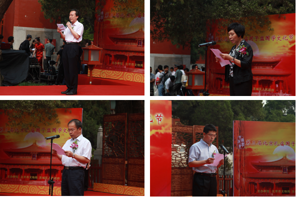 9月9日,在具有700多年历史的孔庙大成殿广场前,“第三届北京孔庙国子监国学文化节”隆重开幕。北京市委宣传部副部长、首都文明办主任陈冬,北京市文物局局长孔繁峙,北京市文物保护协会会长许金和、市文物局副局长于平、刘超英、副巡视员田淑芳;东城区区委书记杨柳荫和其他领导:常卫、朴学东、宋甘澍、毛炯、蔡福全、颜华、汤钦飞、邵鹏;中华孔子学会副会长周桂钿、专家学者郑万耕、李景林等,以及北京市文博系统的馆长、书记、东城区相关委办局领导、优秀教师代表、学生代表、社区居民代表、新闻媒体记者等600余人参加了开幕式。