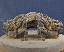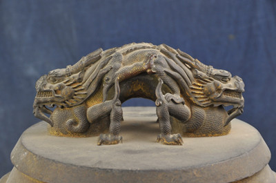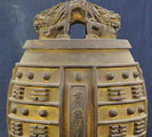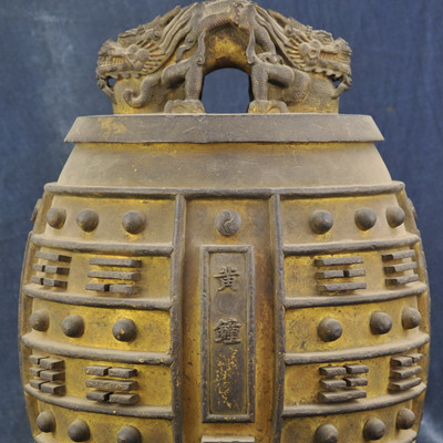 康熙八卦鎏金黄钟编钟 清康熙年年制。此套编钟,含钟十六枚。每枚编钟钟身均铸有律名及作钟年款。图示编钟律名“黄钟”,钟钮作伏卧双龙,钟体饰八卦云龙纹,钟底饰满月八枚。现存于孔庙和国子监博物馆。