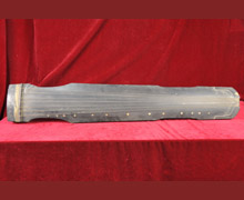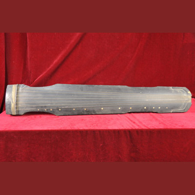 乾隆三十四年制七弦琴 清乾隆年制。木制弦乐器,仲尼式。前宽后窄,上圆下方。琴体素面,原镶徽十三枚,饰以蚌,附七弦。额首有描金“乾隆三十四年制”款。现存于孔庙和国子监博物馆。
