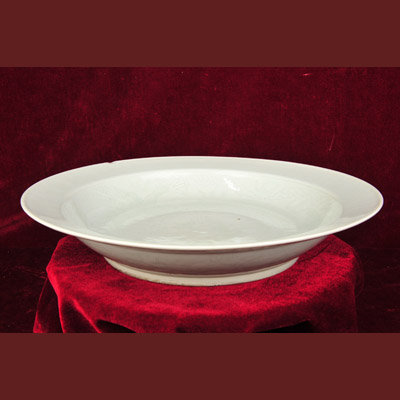 光绪粉青釉暗刻云龙纹折沿大盘 清光绪年制。通体粉青釉,釉质圆润。折沿。盘中饰暗刻云龙戏珠纹,外侧饰暗刻四季花卉吉祥图案。底署三行六字阳文楷书“大清光绪年制”款。现存于孔庙和国子监博物馆。